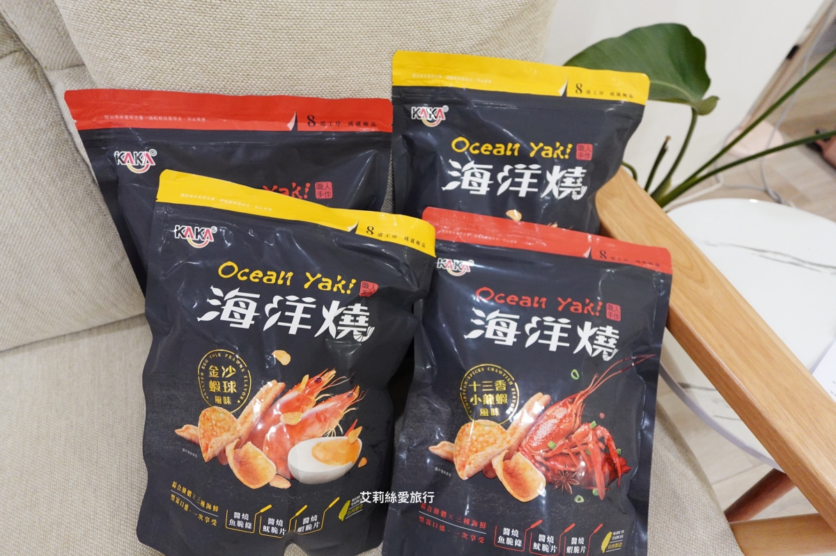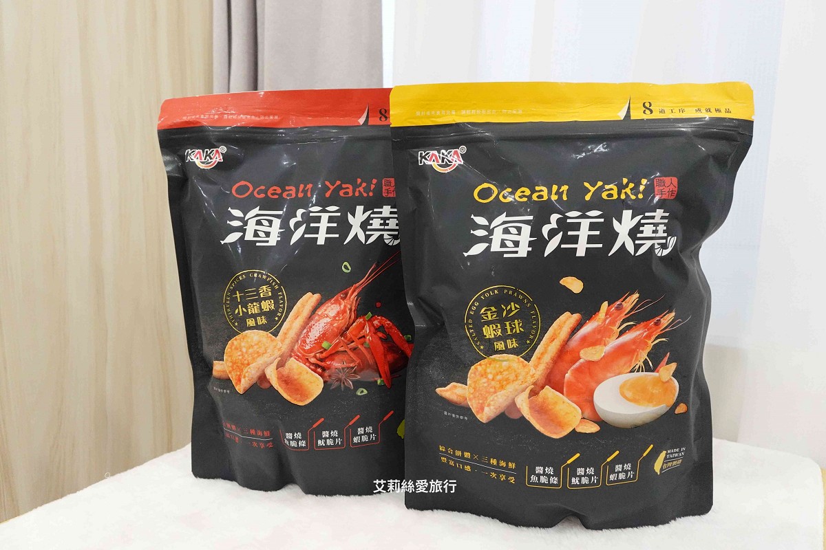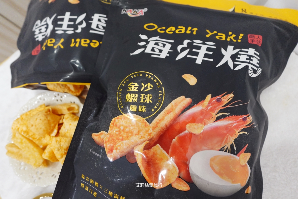 台灣好吃零食伴手禮推薦!台灣在地美食「KAKA海洋燒蝦餅」新口味大包裝「金沙蝦球」、「十三香小龍蝦」,一包內含三種經典餅乾:「烤蝦、烤魚、烤魷」,三種海鮮口味、三種特別口感,豐富多層次一次好滿足。 KAKA海洋燒堅持職人手作精神:嚴選食材、八道工序、四大淬鍊,只為成就豐富層次的美食!